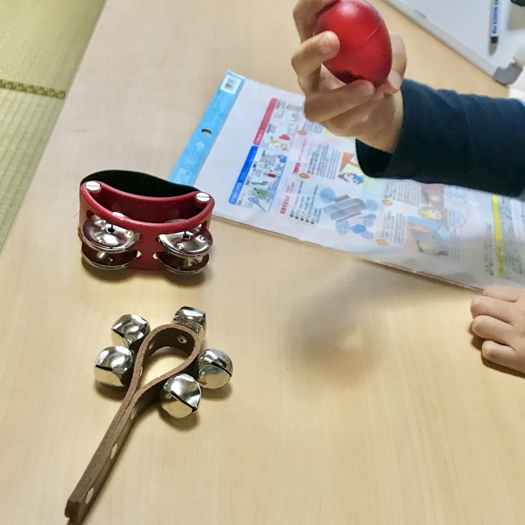 たまごマラカスや鈴など,お友達がたくさんの楽器を持ってきてくれました。楽しい!