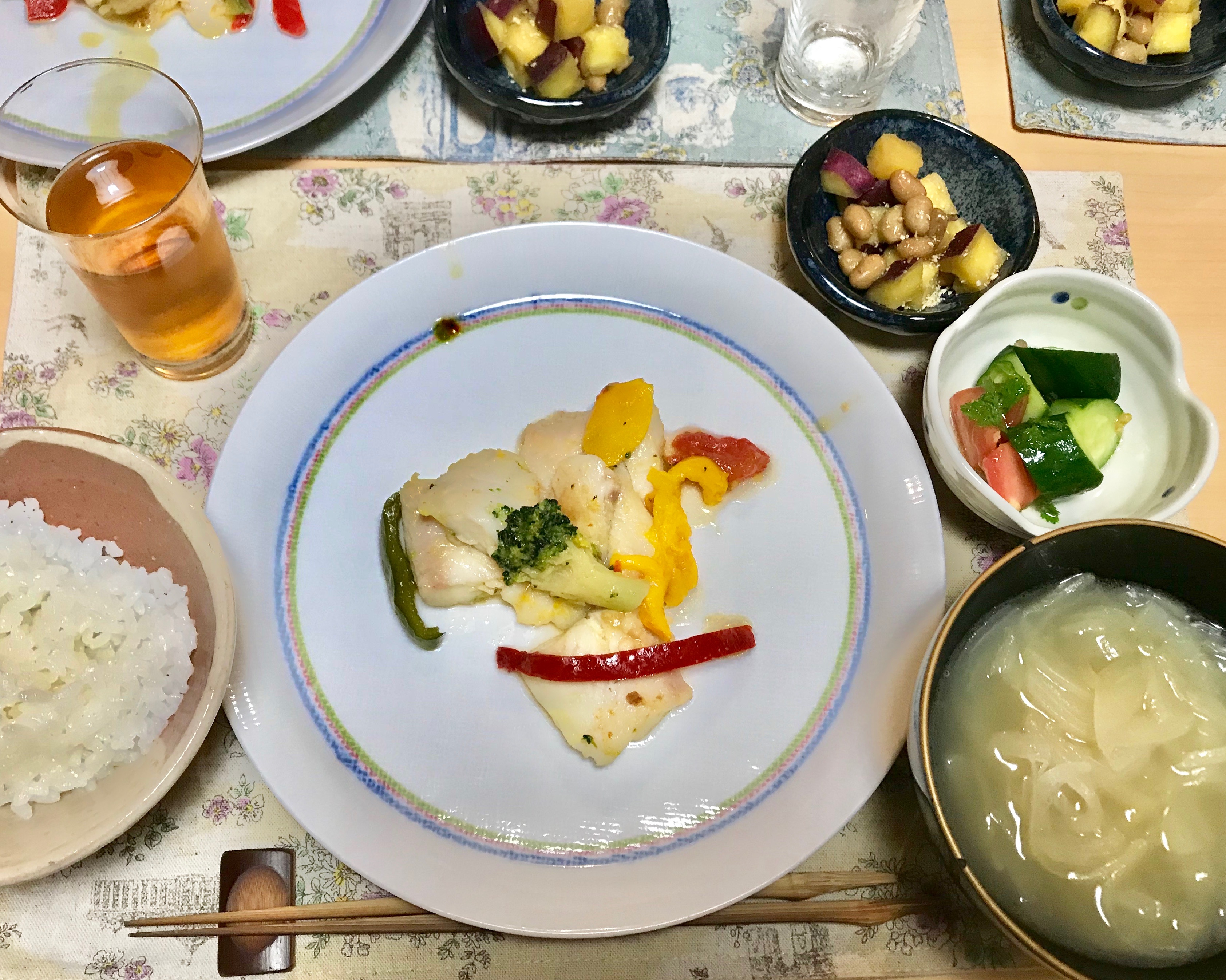 白身魚のソテー。キュウリサラダはハーブを使ってちょっと珍しい味に。