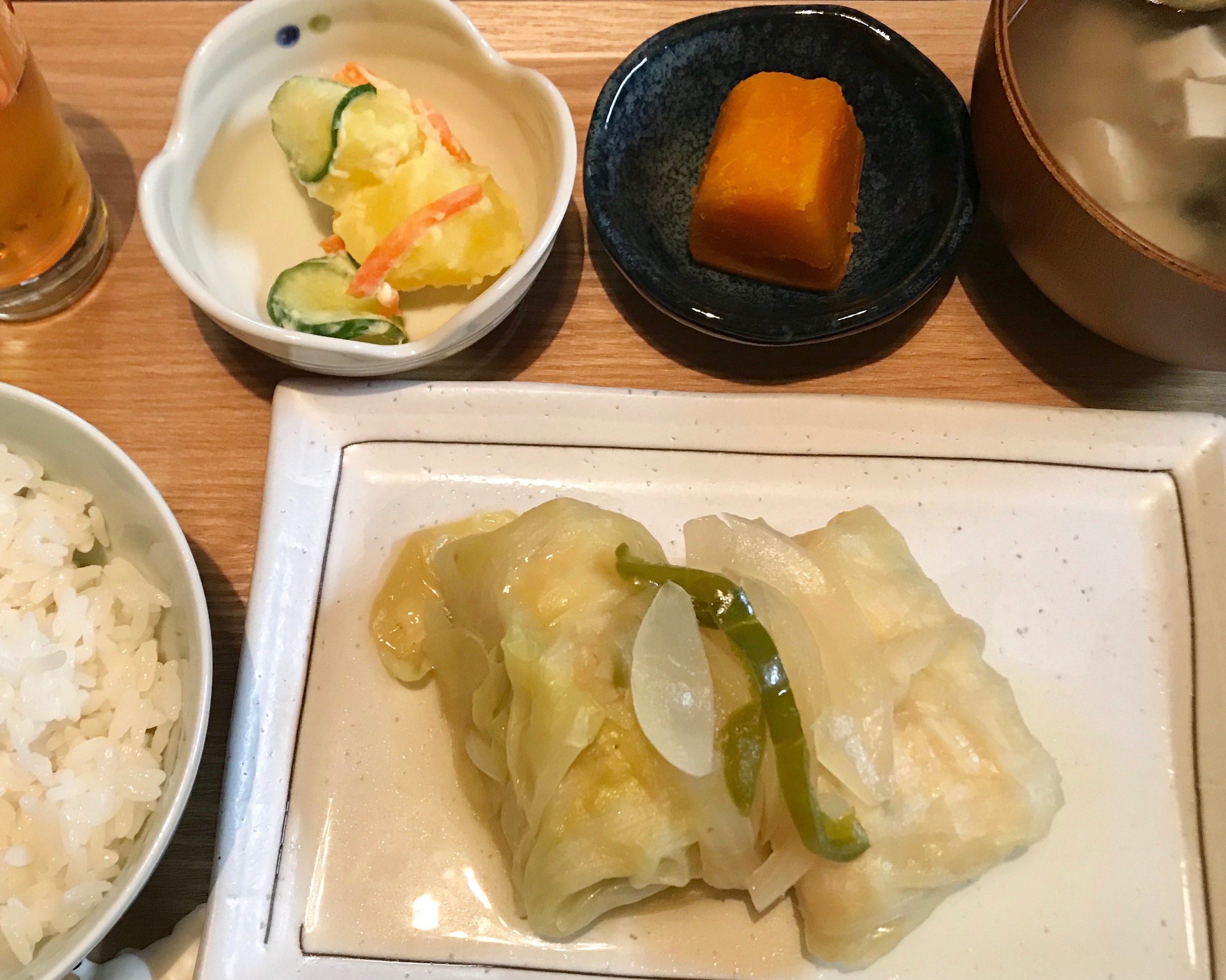 コンソメ味のロールキャベツ。ジャガイモとカボチャは穫れたてをお分けいただきました。