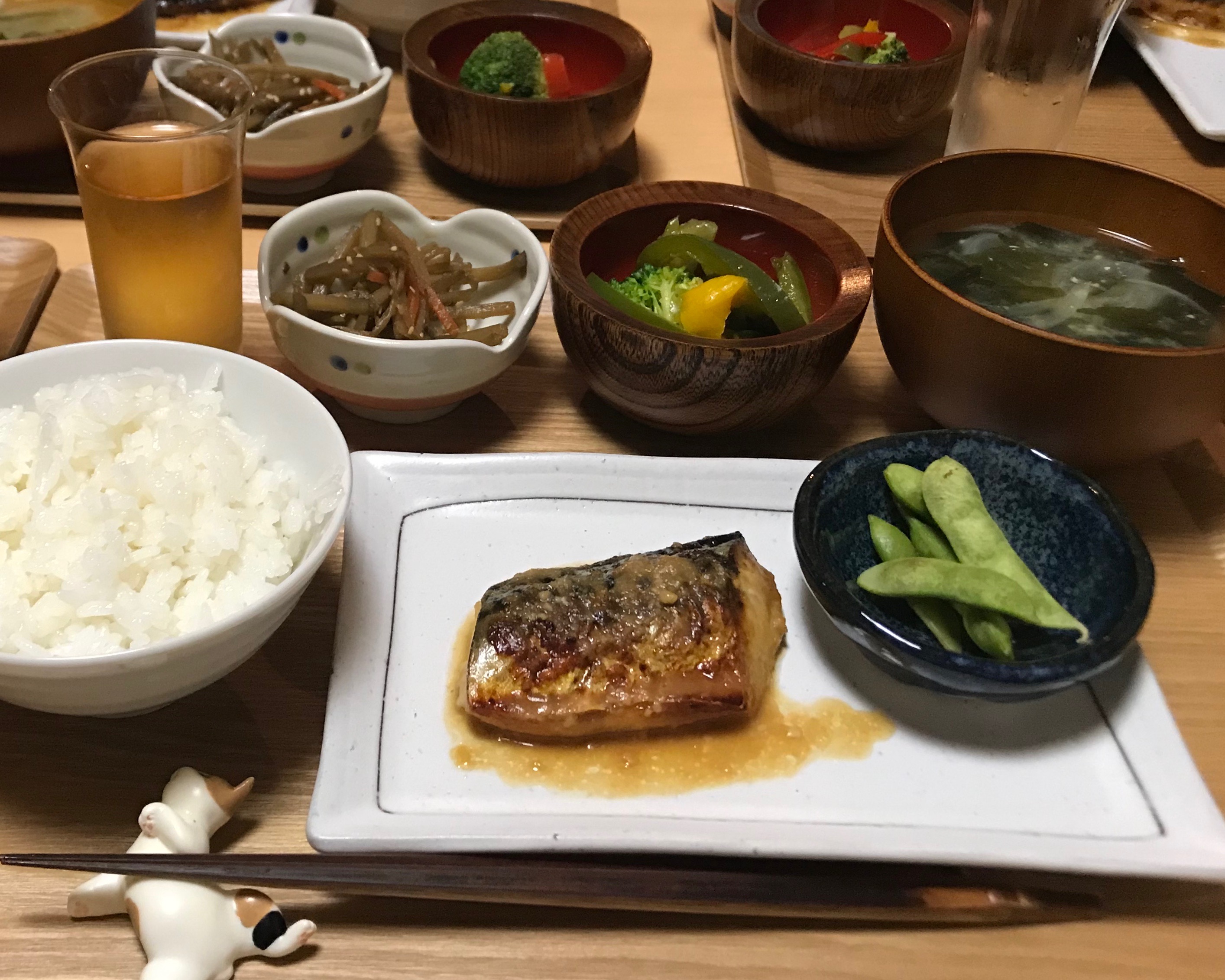 焼きサバのようなサバの味噌煮のような。枝豆も香ばしく焼いています。