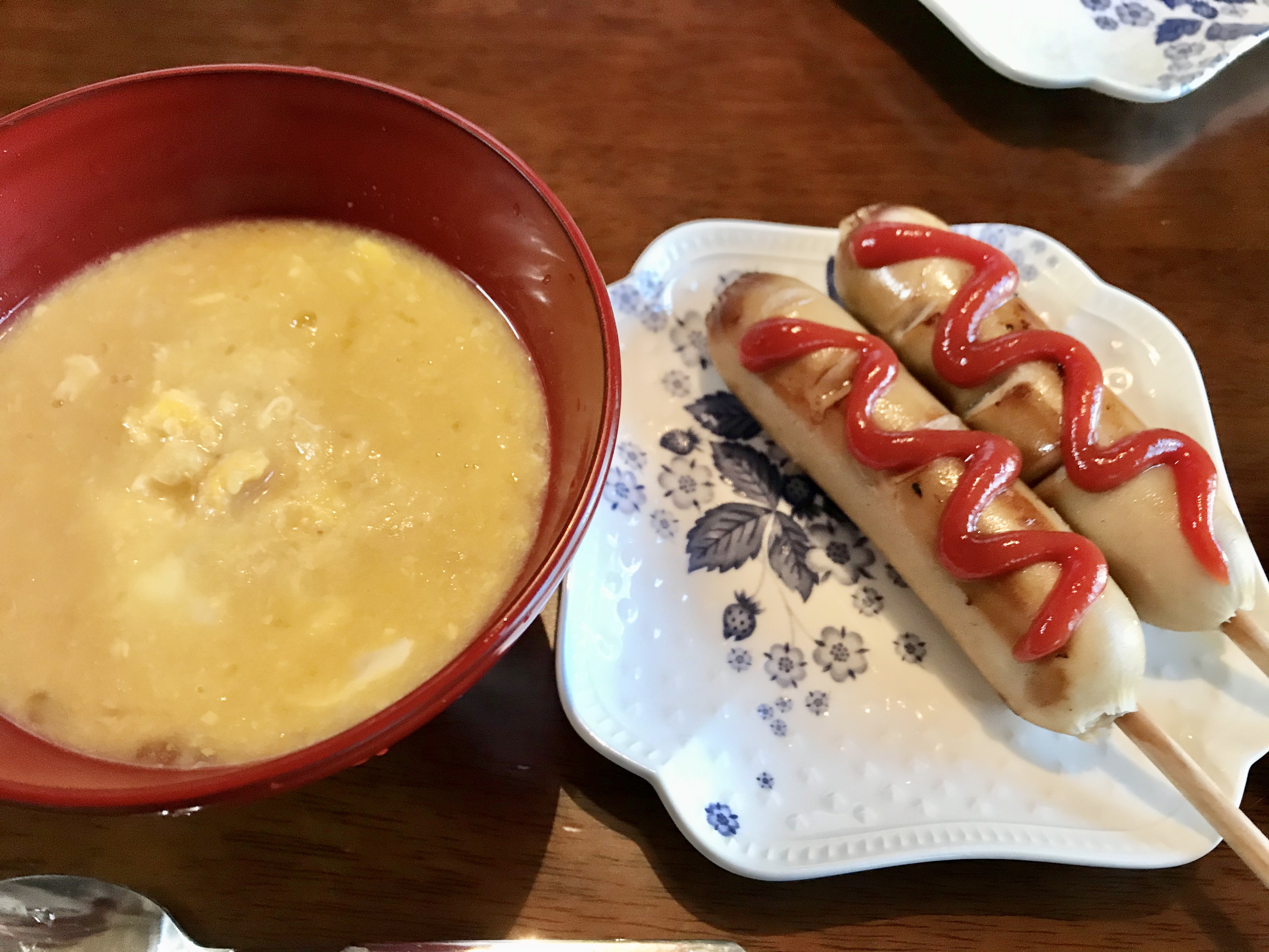 フランクフルトと中華コーンスープ。